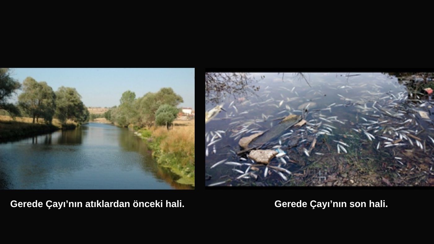 Gerede ilçesinde, Deri Organize Sanayi ve Deri İhtisas Sanayi bölgeleri bulunuyor. Söz konusu sanayi bölgelerinde atık su arıtma tesisi ya var ve yeterli değil ya da büyük bir kısmı sistem kurulu olduğu halde kullanılmıyor. Deri tabakalama işleminde kullanılan krom, insan sağlığı ve çevre için son derece zararlı bir maddedir. Bunun dışında kireçleme, soyma ve kükürtleme işlemlerinde kullanılan hidrojen sülfür gazı ise kötü kokuya neden olan bir maddedir. Ayrıca deri boyama işlemlerinde kullanılan yağ giderici gibi kimyasal maddeler deriyi işleme sırasında da suya karışıyor. Böylelikle bu tesislerden çıkan atıklar Gerede Çayı’na dökülerek fabrikalar üretimine devam ediyor. Suyun değişen yapısı da içerisinde canlı barındıramaz bir hal alıyor.