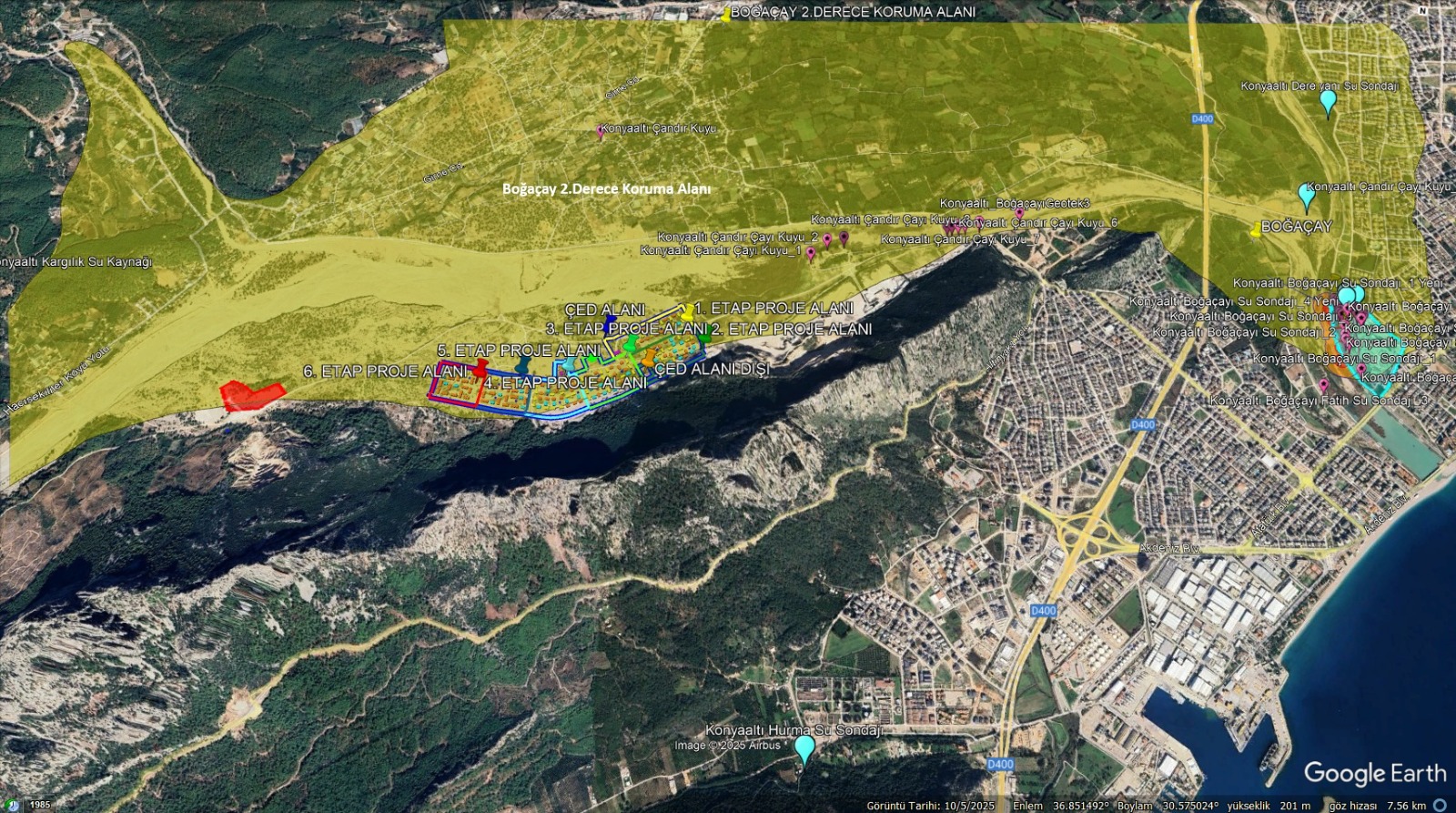 Jeoloji Mühendisleri Odası Antalya Şubesi tarafından yapılan açıklamada, talep edilen alanın 28 Aralık 2009 tarihli Resmî Gazete’de yayımlanan Boğaçayı Kaynağı İçme Suyu Kuyuları Koruma Alanı sınırları içerisinde kaldığı hatırlatıldı. Bölgenin II. Derece İçme Suyu Koruma Alanı statüsünde olduğu belirtilirken, ilgili mevzuat uyarınca bu alanlarda kum ve çakıl temininin kesin biçimde yasak olduğu ifade edildi.