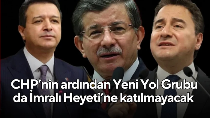 DEVA Partisi, Gelecek Parti ve Saadet Partisi'nin ortak grubu olan Yeni Yol Grubu, İmralı Adası'na gitmeyeceklerini açıkladı. Grup, Genel Başkanlar Ali Babacan, Ahmet Davutoğlu ve Mahmut Arıkan'ın değerlendirmesi sonrası, Milli Dayanışma, Kardeşlik ve Demokrasi Komisyonu'ndan heyete temsilci gönderilmemesi kararını aldı.