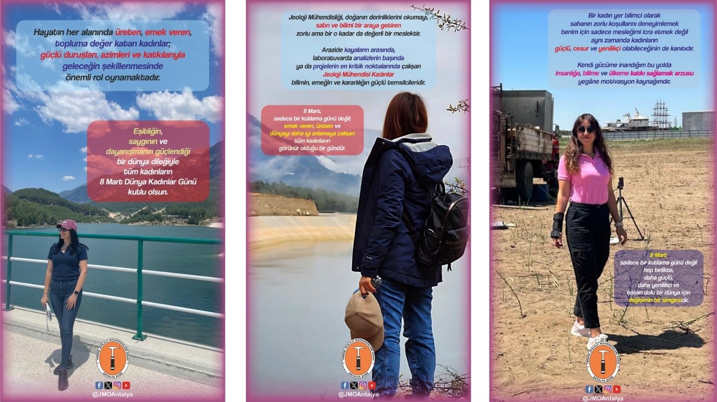 TMMOB Jeoloji Mühendisleri Odası Antalya Şubesi’nin kadın üyeleri, 8 Mart Dünya Kadınlar Günü dolayısıyla yaptıkları açıklamada jeoloji mühendisliğinin doğanın derinliklerini anlamaya yönelik sabır, disiplin ve bilimsel çalışma gerektiren önemli bir meslek olduğunu vurguladı. Kadın mühendisler, hem sahada hem laboratuvarlarda yürüttükleri çalışmalarla bilimin ve emeğin güçlü temsilcileri olduklarını ifade etti.