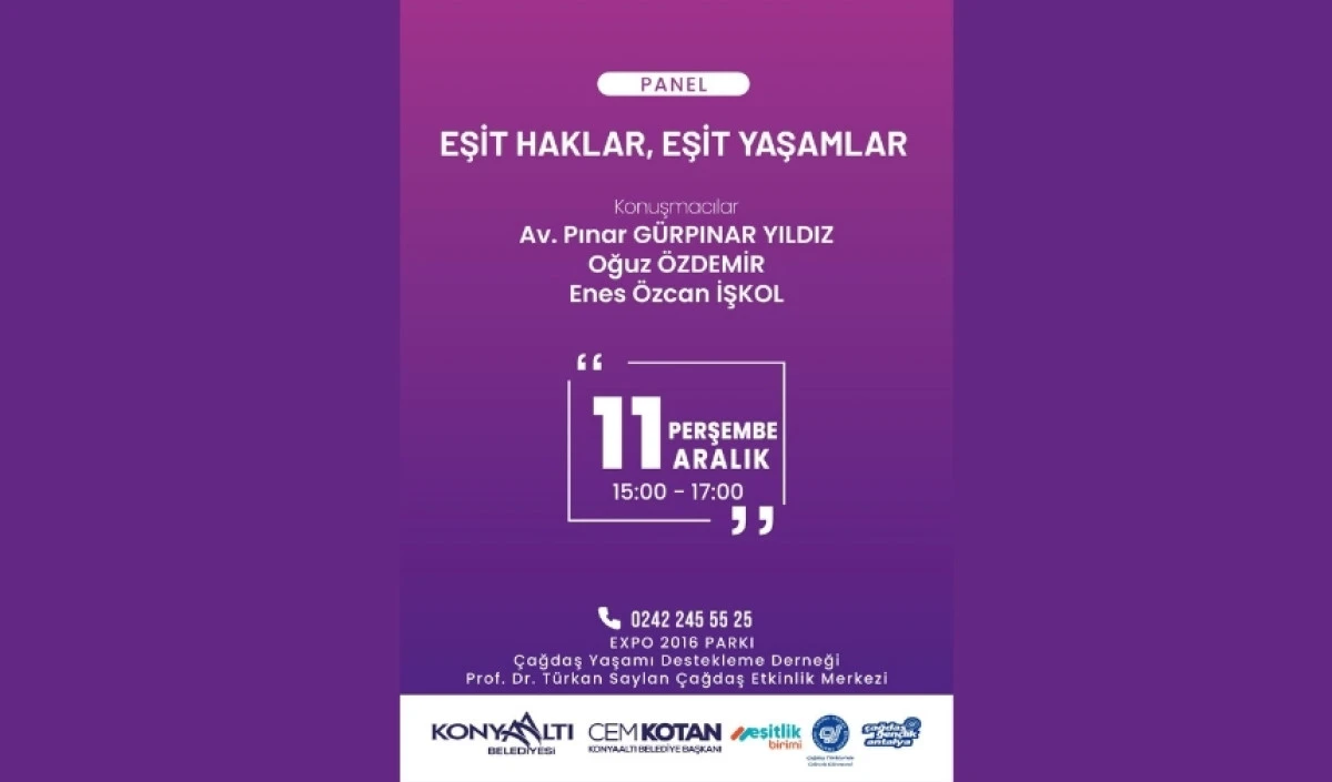 Konyaaltı Belediyesi, ‘Eşit Haklar, Eşit Yaşamlar’ konulu paneli 11 Aralık Perşembe günü EXPO Parkı’nda Çağdaş Yaşamı Destekleme Derneği iş birliğiyle gerçekleştirecek