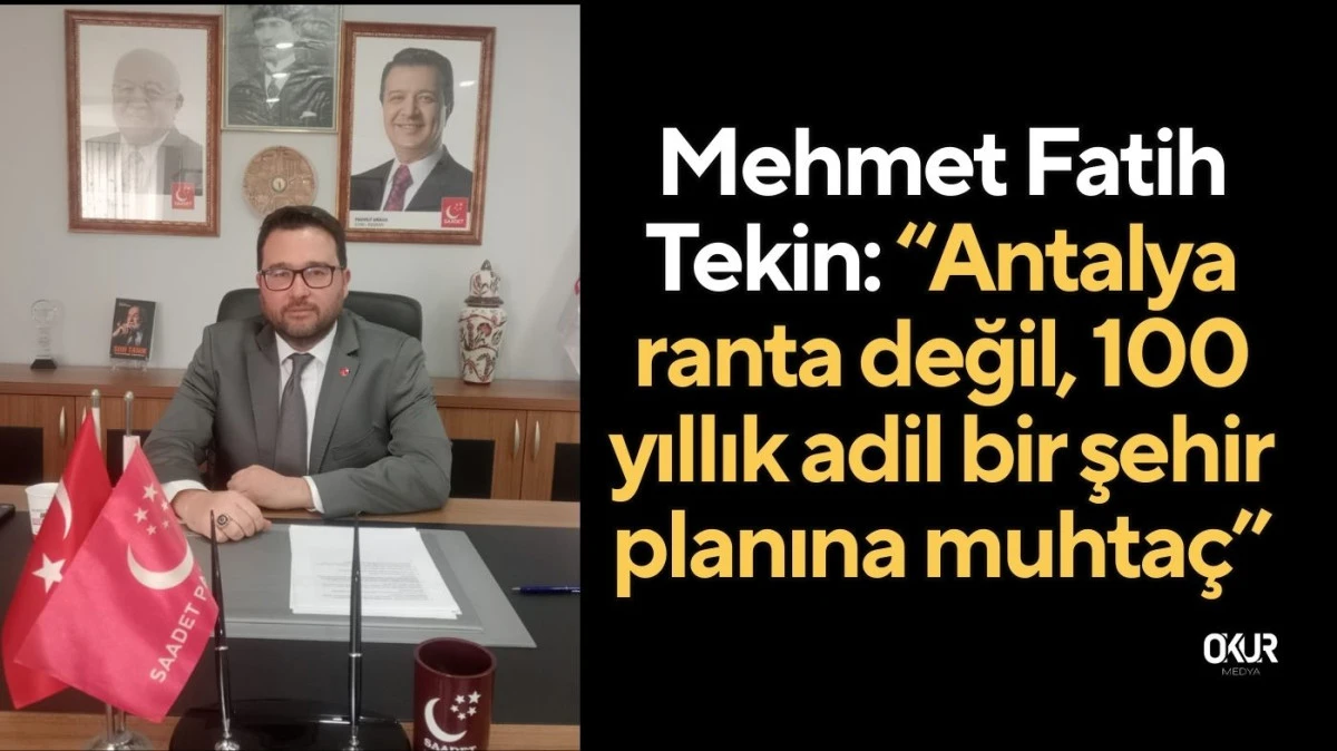 Saadet Partisi Antalya İl Başkanı Mehmet Fatih Tekin, Antalya’nın altyapı, trafik ve yanlış kentleşme sorunlarına dikkat çeken açıklamalarda bulundu. Kentin geleceğinin ranta kurban edilmemesi gerektiğini belirten Tekin, “Antalya ranta değil, 100 yıllık adil bir şehir planına muhtaç” dedi.