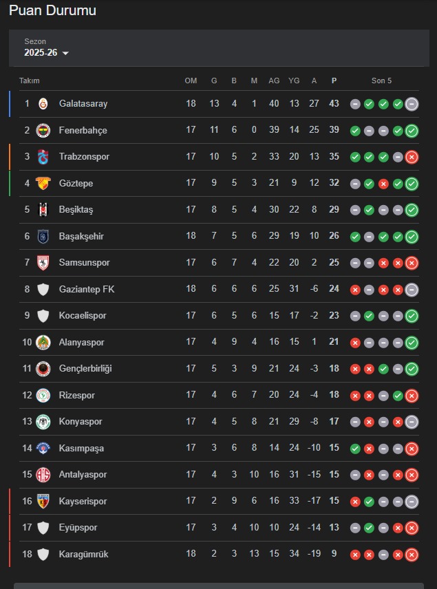 Süper Lig puan durumu