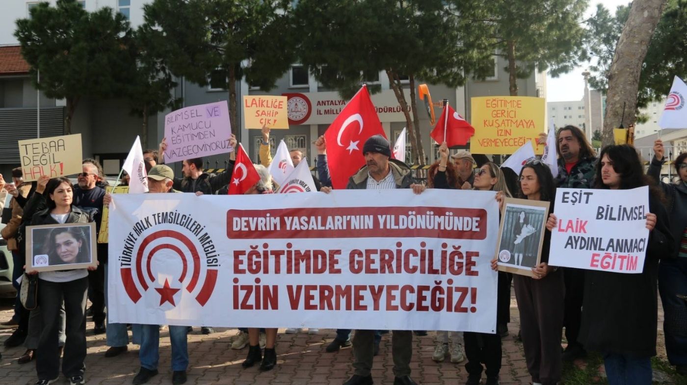 Türkiye Halk Temsilcileri Meclisi (THTM) Antalya Öğretmen İnisiyatifi, 3 Mart Devrim Yasaları’nın yıl dönümünde Antalya’da bir araya gelerek eğitim politikalarına ilişkin açıklamada bulundu. Buluşma, Antalya İl Milli Eğitim Müdürlüğü önünde gerçekleştirildi.